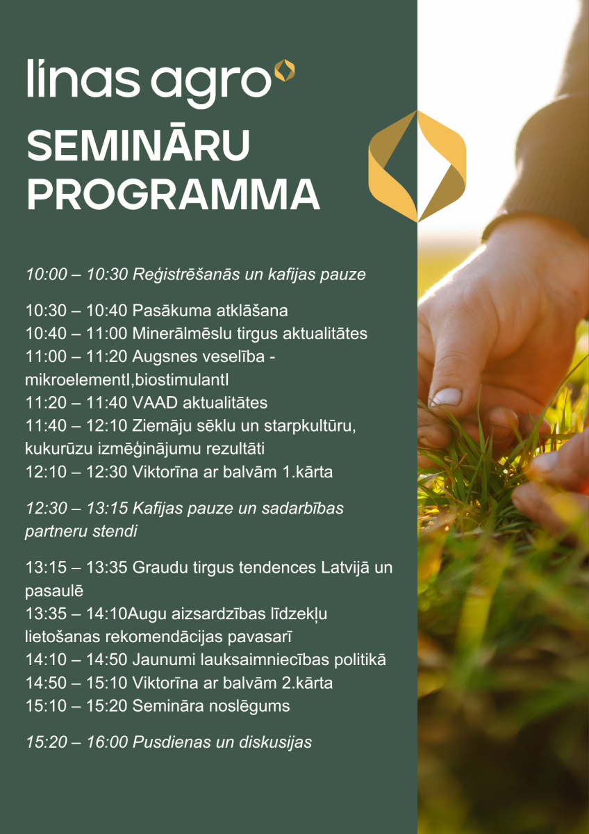 Semināru laikā Linas Agro produktu grupu vadītāji sniegs ieskatu minerālmēslu tirgus aktualitātēs - kas gaidāms šajā pavasara cēlienā?, AAL un mikroelementu produktu portfolio un jaunumos tirgū, iepazīstināsim ar sēklu izmēģinājumiem gan no Linas Agro Lielo lauku dienu izmēģinājumiem, gan citviet Latvijā veiktajiem - lai vieglāk izvēlēties šķirnes pavasara un rudens sējai, tāpat pārrunāsim graudu tirgus izacinājumus Latvijā un pasaulē.